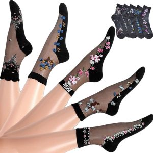 Womens Embroidered Ankle Sheer Mesh Socks Set