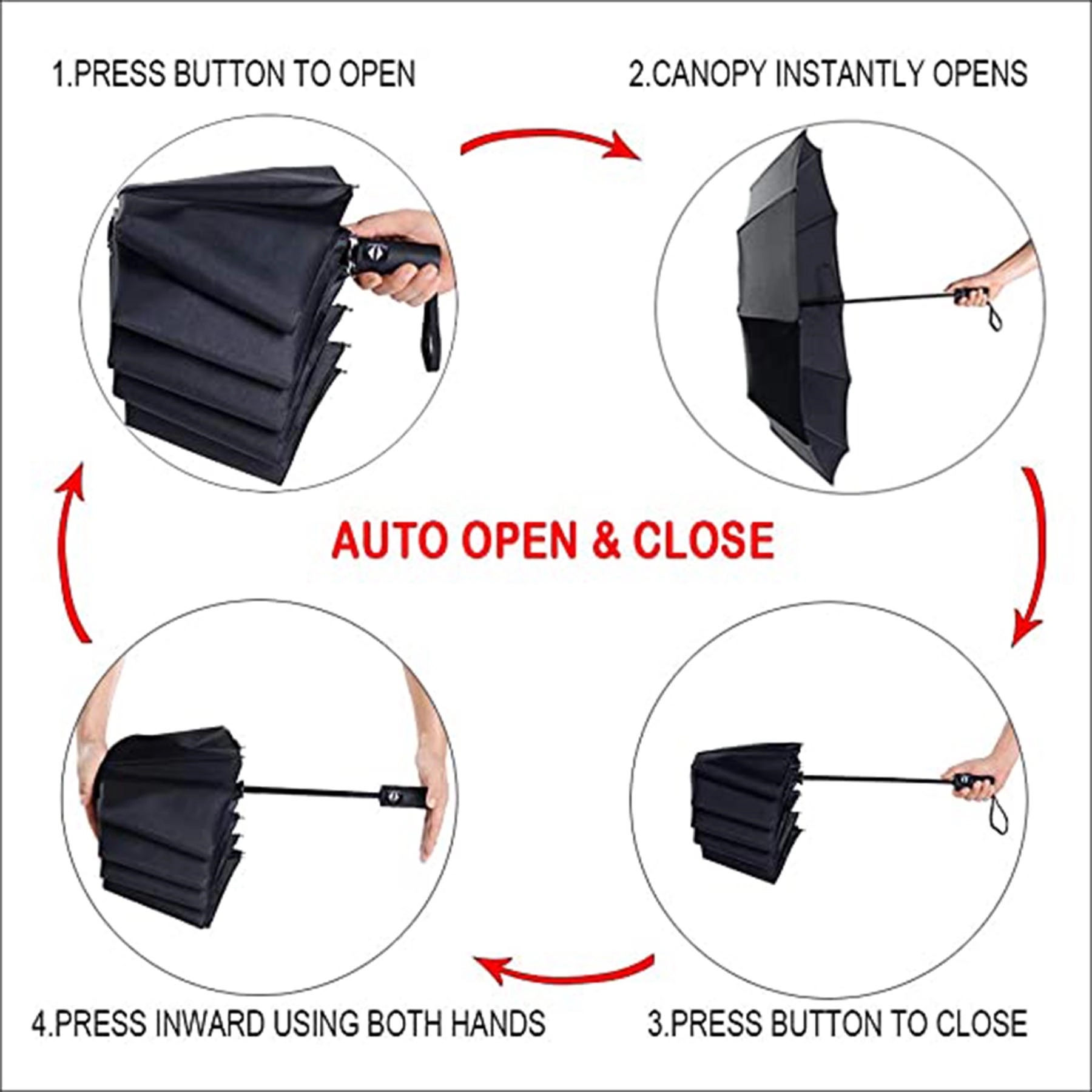 Auto open/close function is easy to use. Collapsible umbrella is easy to store in bag, briefcases, backpacks, luggage and more.