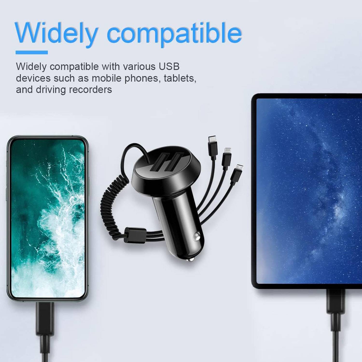 3 in 1 Fast Dual Ports Car Charger with Stretchable Cable