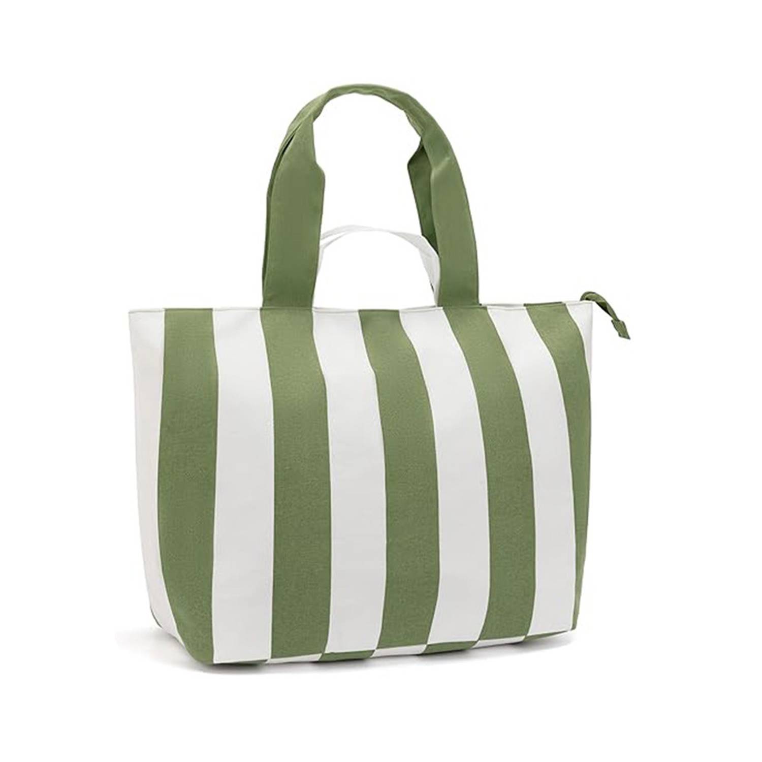 A ladies’ oversized canvas beach bag featuring a zipper closure, spacious enough to carry all your beach essentials.