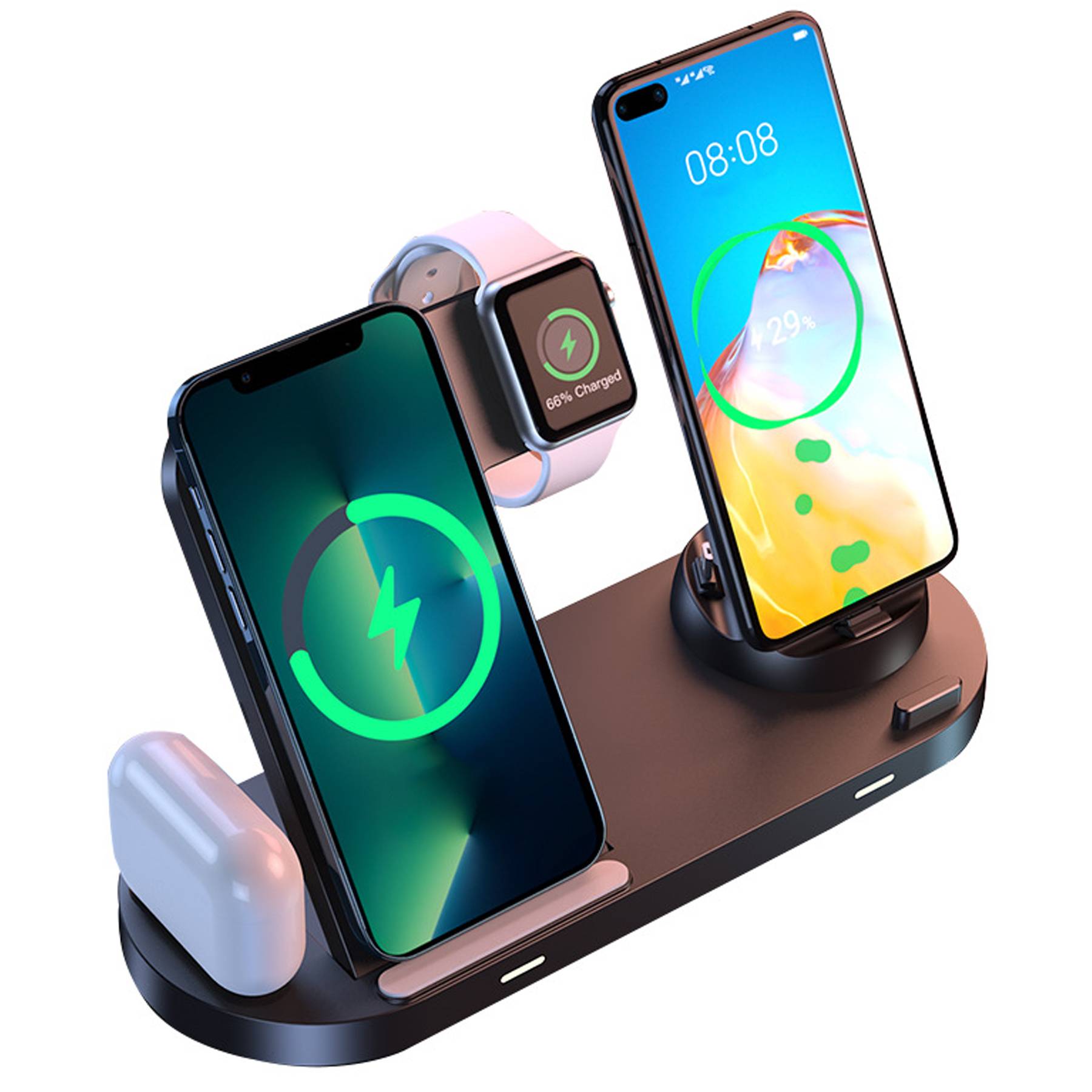 6-in-1 Wireless Charging Stand: Keep all your devices charged simultaneously—phone, Apple Watch, Type-C, and Air Pods. This charging station provides a secure and stable connection, preventing device slippage. With wireless fast charging, your iPhone can go from 0% to 80% in just 45 minutes, ensuring you can quickly get back to using your devices.