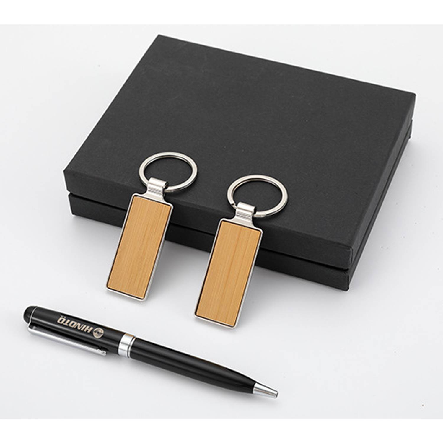 Introducing this luxurious Business Gift Set, a perfect blend of practicality and elegance. Encased in a sleek black rectangular box with an open lid, this set reveals three exquisite items: a black ballpoint pen, two wooden-textured keychains, and a compact black box The keychains, crafted with a simple yet sophisticated design, exude a warm light wood color that contrasts beautifully against the dark backdrop of the box.