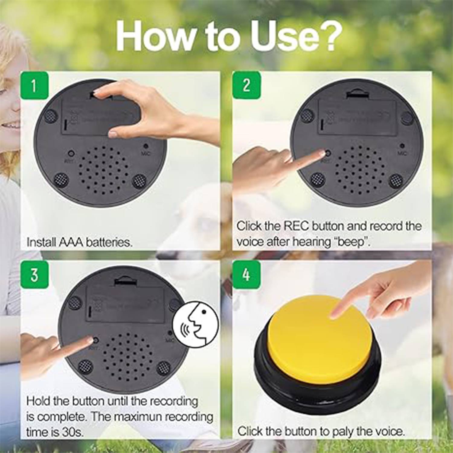 The recording button can record up to 30 seconds, and the sound is clear. You can repeat the sound you recorded, or you can re-record it. Small size, easy to carry. Very practical and interesting.You can record commands such as “food”, “drink”, “outside”, “yes” and “no” to let your pet communicate with you; just a little patience can make you understand the pet’s mind. Very suitable for training cats, dogs and other pets, different color buttons can be used as options for different training.