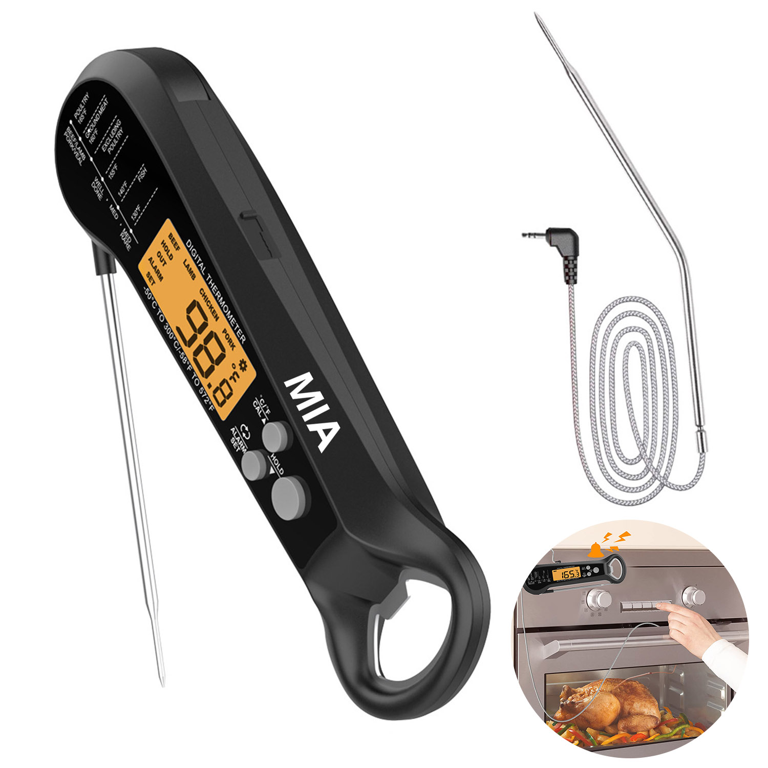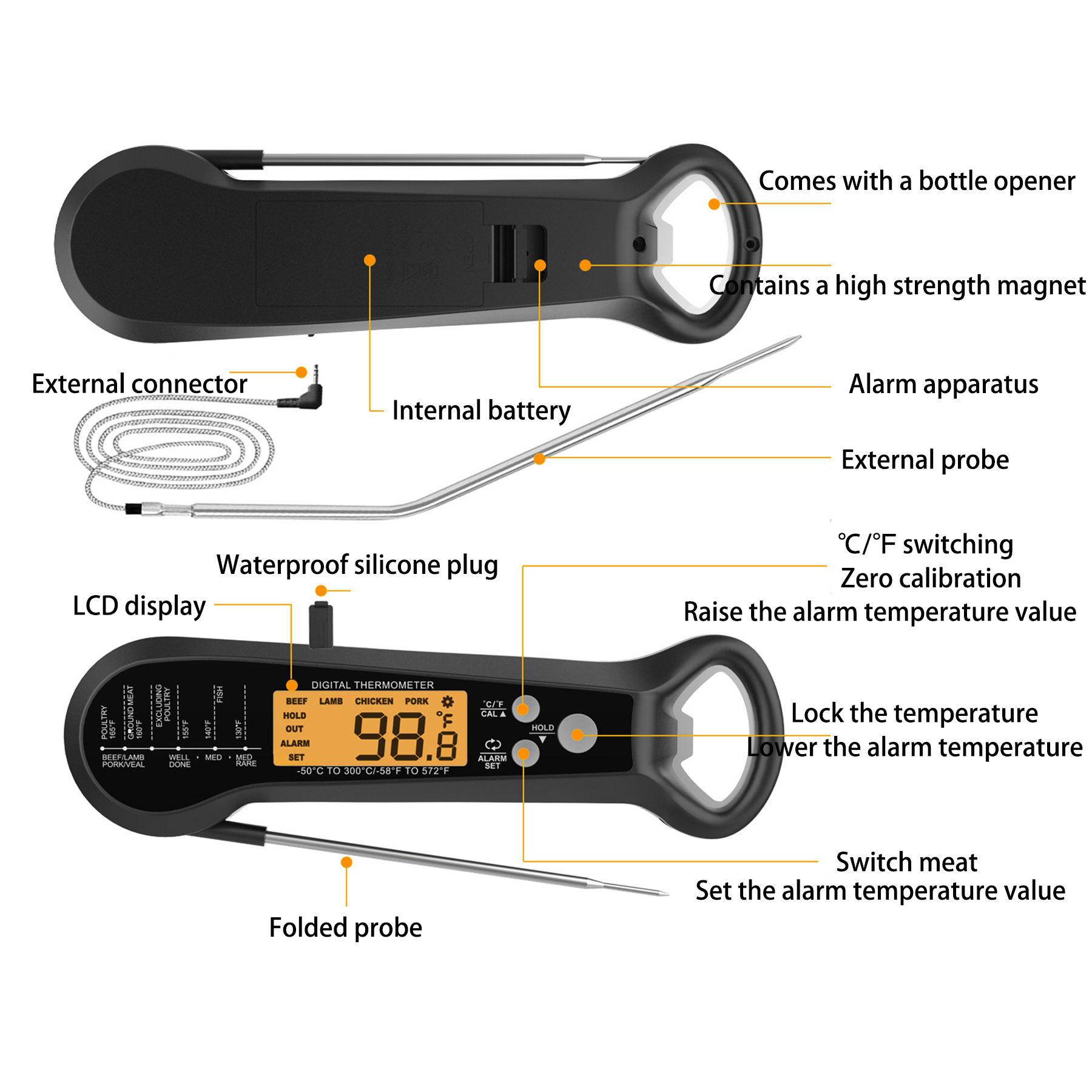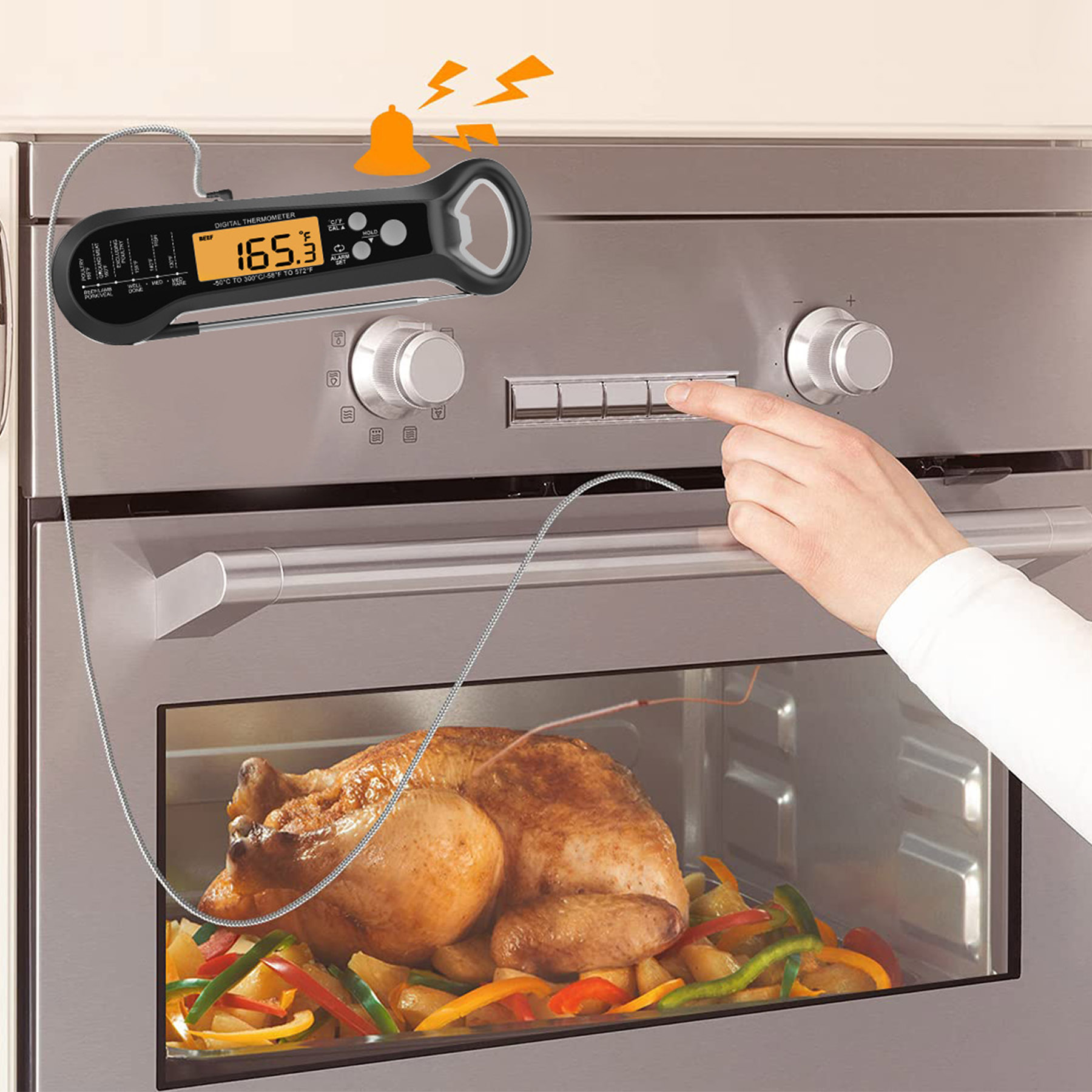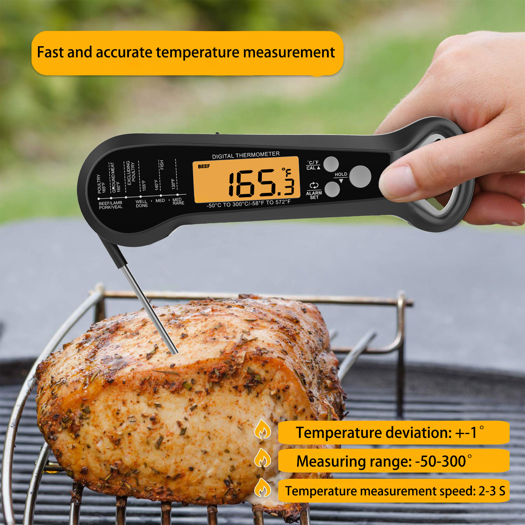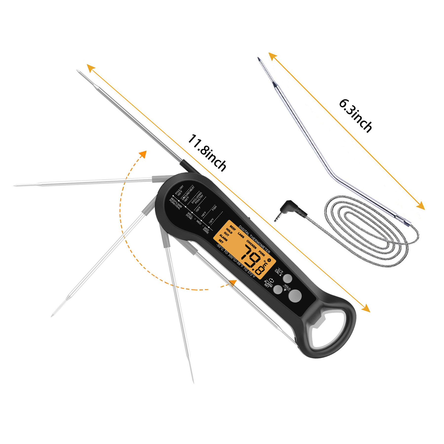 Our instant read thermometers feature a temperature probe and advanced, highly accurate technology with a response time of 2-3 seconds; Description, 2 CR2 button batteries, meat thermometer, 4 hook and ring point storage, pre-calibrated for your convenience, and recalibrated function when needed. The large instant thermometer dial comes with a bright orange backlight, so you can read the temperature at any time, whether you’re grilling in the dark or baking in the kitchen.