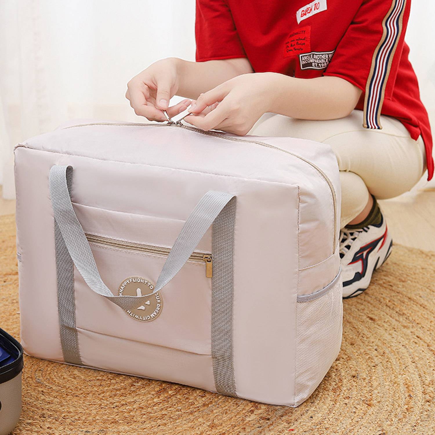 Round logo travel bag: soft, durable, folds for storage. Perfect for trips, camping, home. Organized travelers’ must-have.