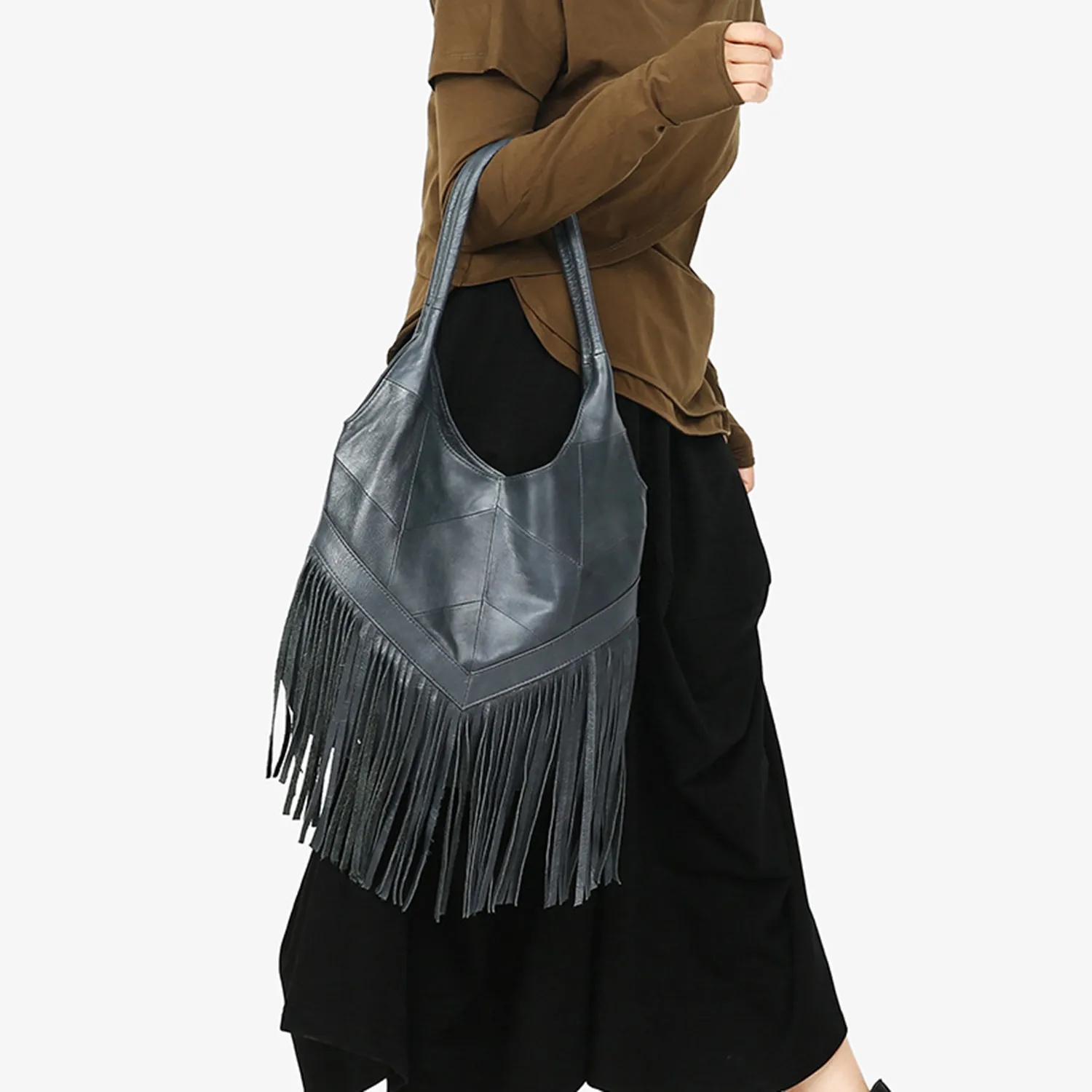 Genuine leather tassel bag with magnetic flap, single shoulder, spacious interior; stylish and perfect for daily use or outings.