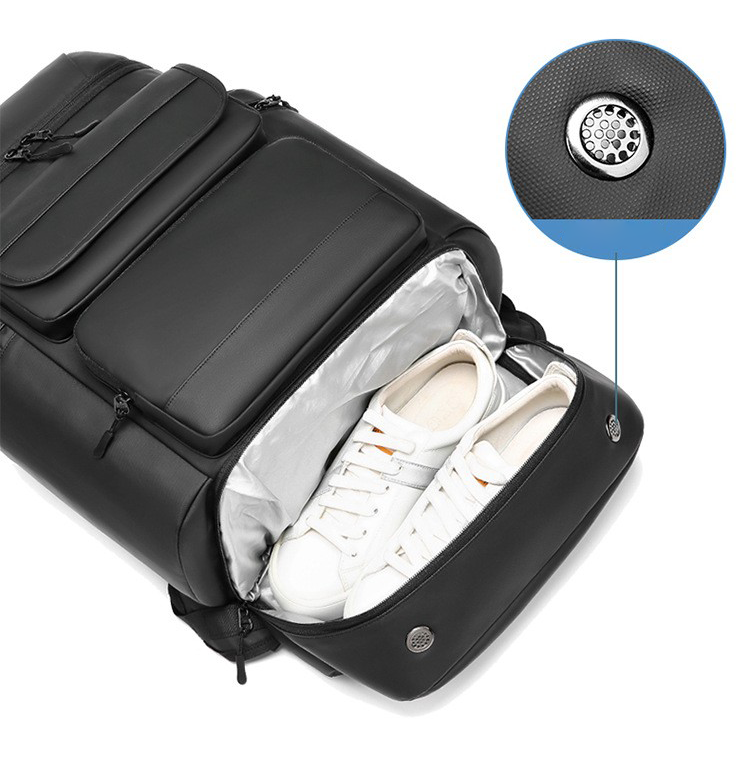 This backpack is anti-theft, high-density waterproof, and scratch resistant. It can be used as a daily backpack, laptop, or professional backpack for daily use, suitable for weekend vacations, occasional international travel, overnight backpacking camping, and high-capacity backpacking hiking. There is an independent shoe cabinet design with waterproof materials, making it easy to clean. The side hole interface design allows for simultaneous connection of USB charging cable.