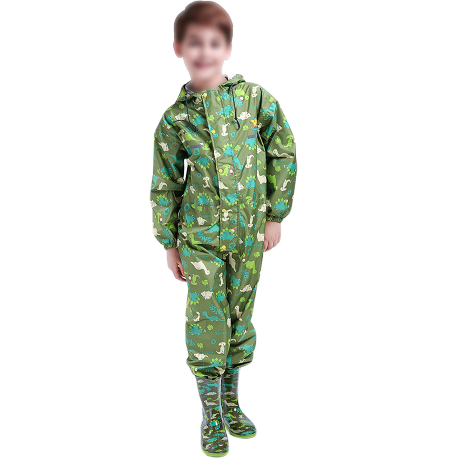 Kids polyester rain suit w/ long sleeves pants. Waterproof dirt resistant cartoon play.