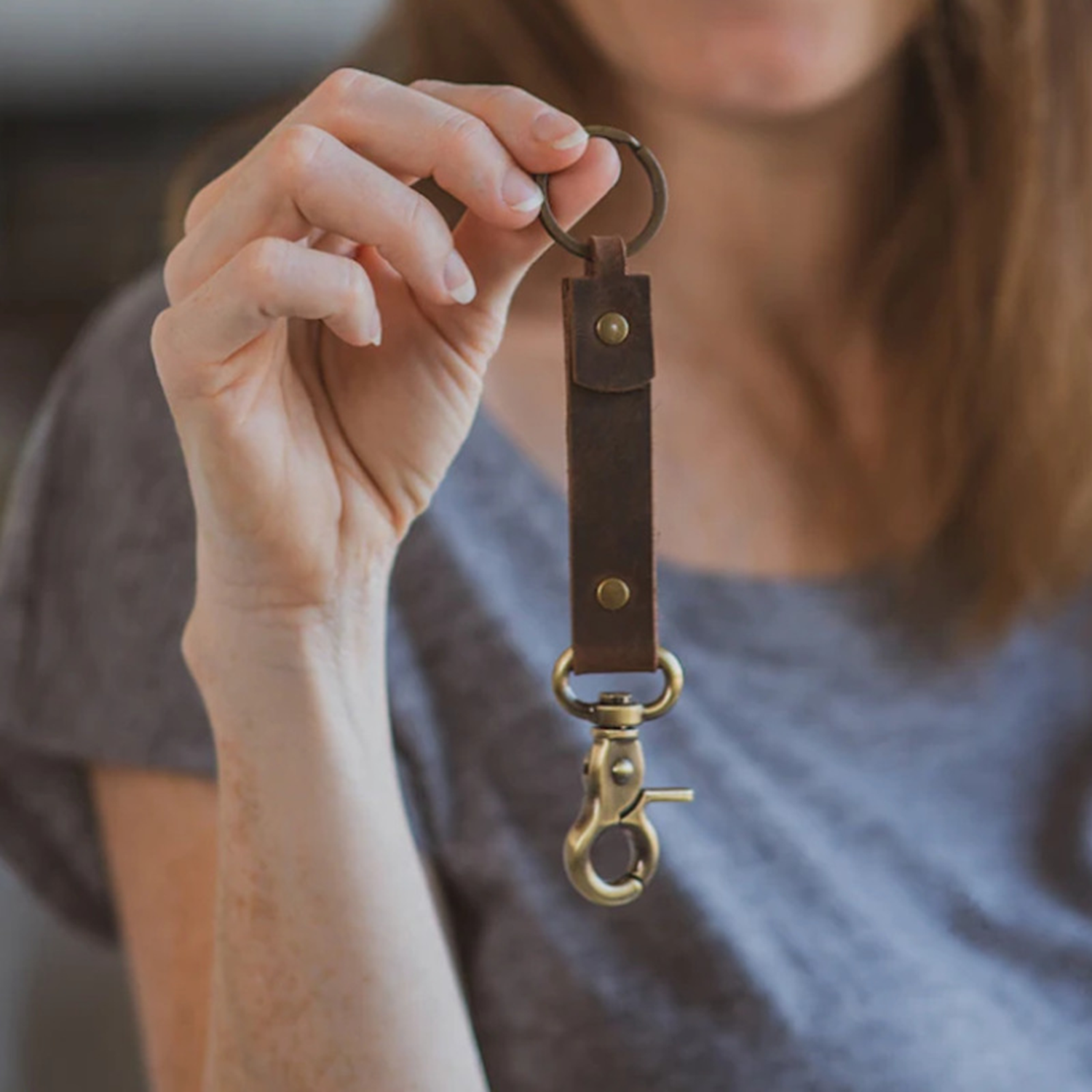 The keychain features a metal ring and a hook, both finished in a copper or brass tone, adding a touch of sophistication. The brown leather complements the metallic accents, creating a harmonious color combination that is both pleasing to the eye and timeless in style. One of the standout features of this keychain is its simple design. This keychain is designed to be minimalistic yet highly functional.
