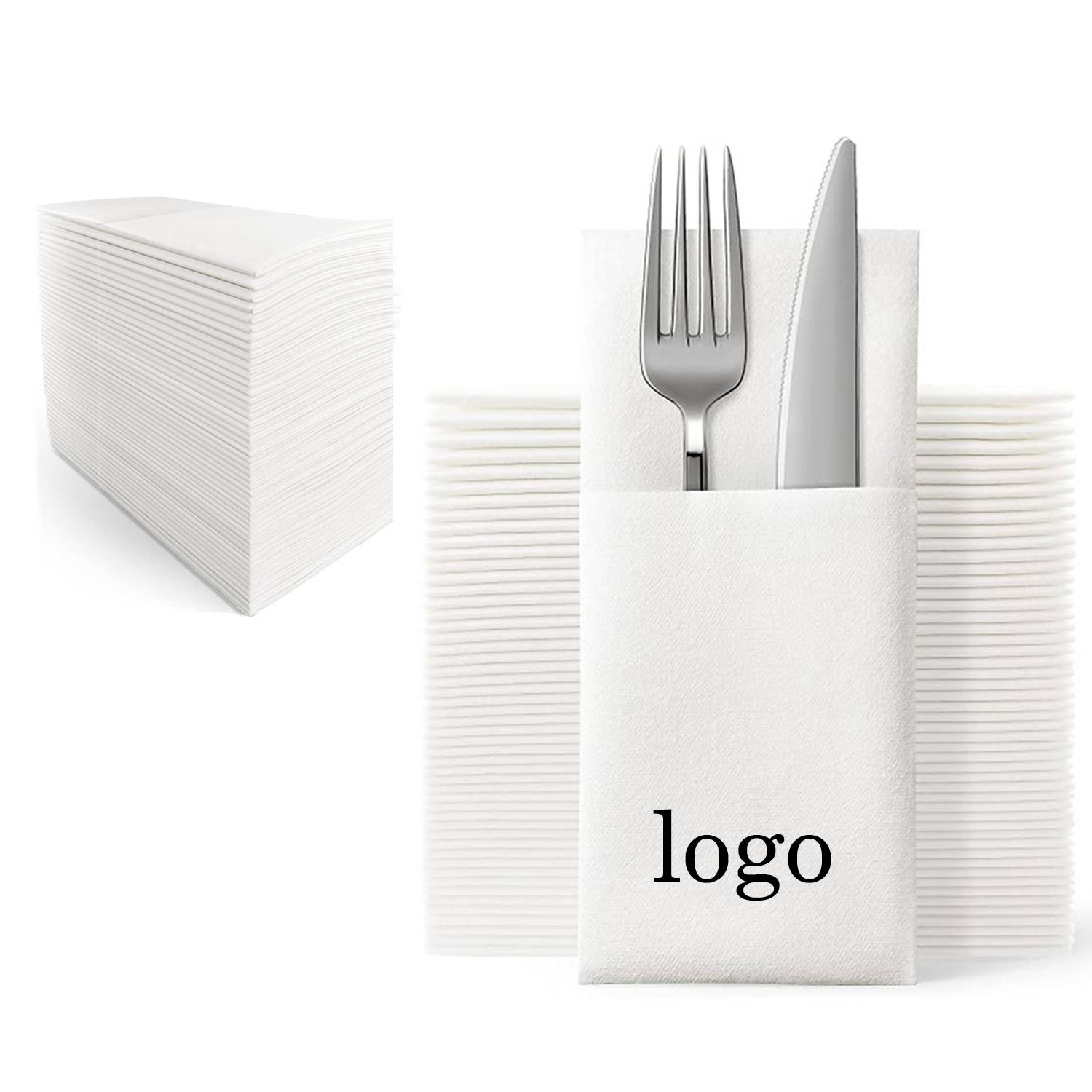 The knife and fork are wrapped in dust-free paper, with 50 sheets in one package and 20 packages in one box. They are sturdy and safe throughout the entire meal process and possess excellent water absorption capabilities, maintaining their integrity even when wet. Each disposable napkin measures 16 x 16 inches unfolded and 4 x 8 inches folded, featuring a built-in flatware pocket for convenience.