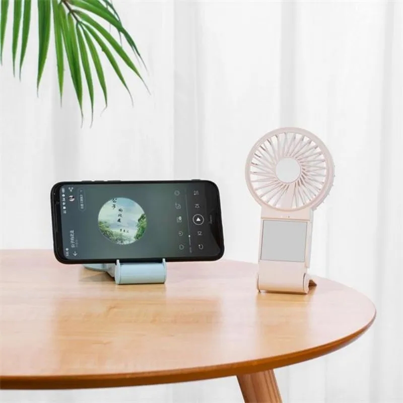 USB rechargeable fan with mini mirror, portable, perfect for travel, outdoor events, and summer use, compact and easy to carry.