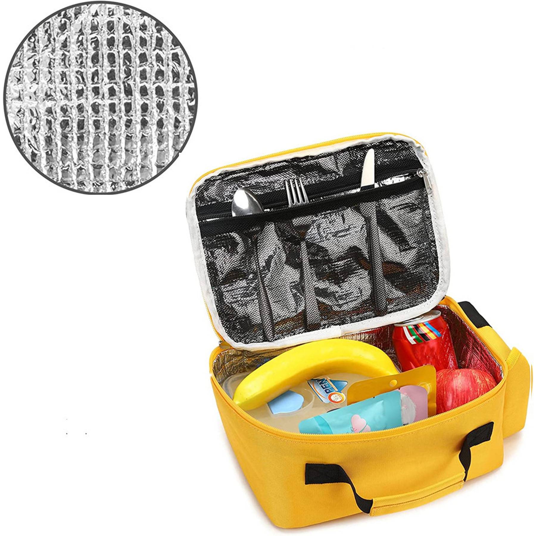 Toddler Lunch Bag features unique prints and 3D school bus design to make your child’s every day special, Size: 9.8”x4.7”x7. 7”, Side pockets for utensils and front zippered pockets for keys, cards, cell phone and other items. The toddler lunch cooler bag is made of sturdy canvas with an aluminum insulated lining that is easy to clean and BPA free.