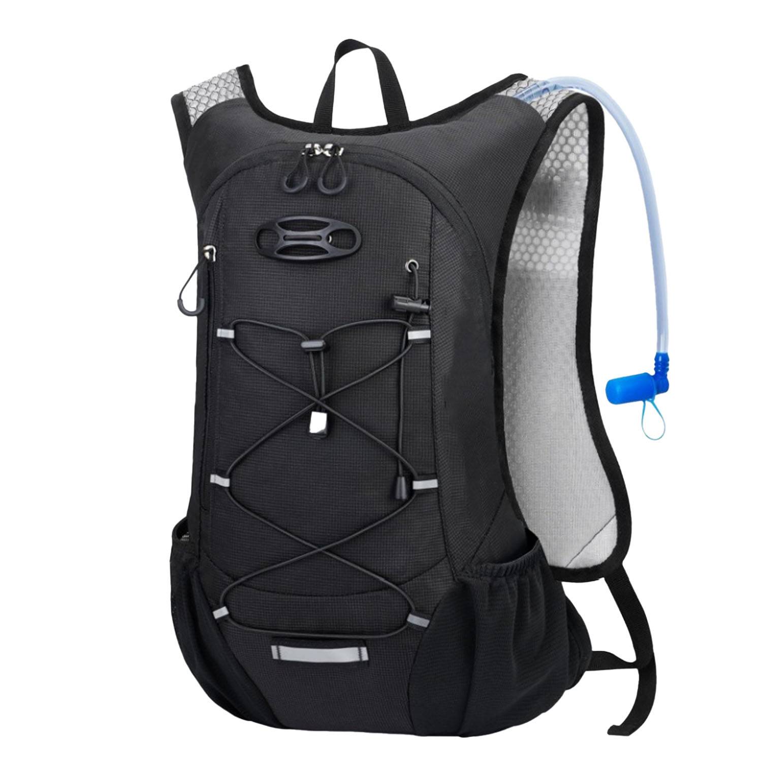 Lightweight polyester hydration backpack with 2L bladder for hands-free hydration during hiking, cycling, and running.
