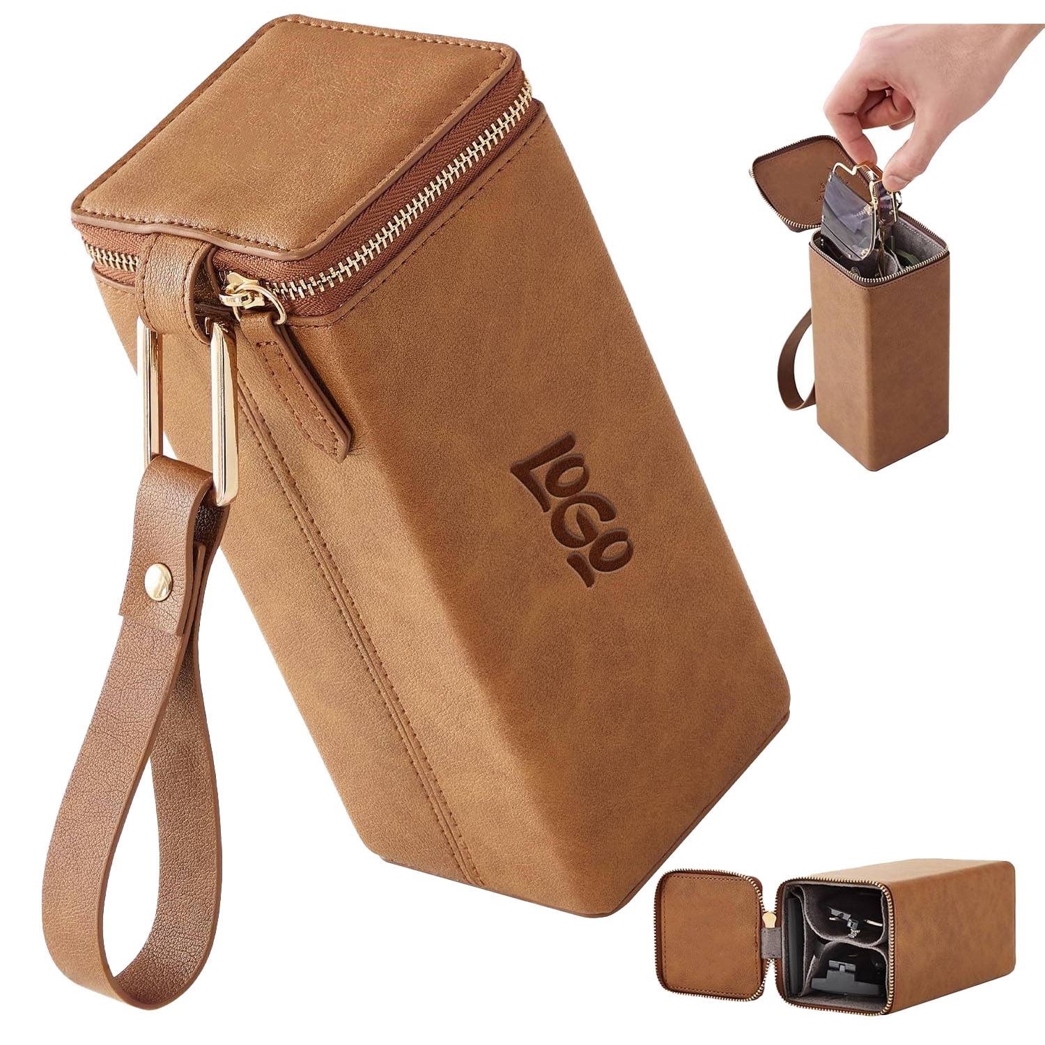Durable PU leather eyeglasses case with secure zipper, compact design for travel, daily use, and eyewear protection.
