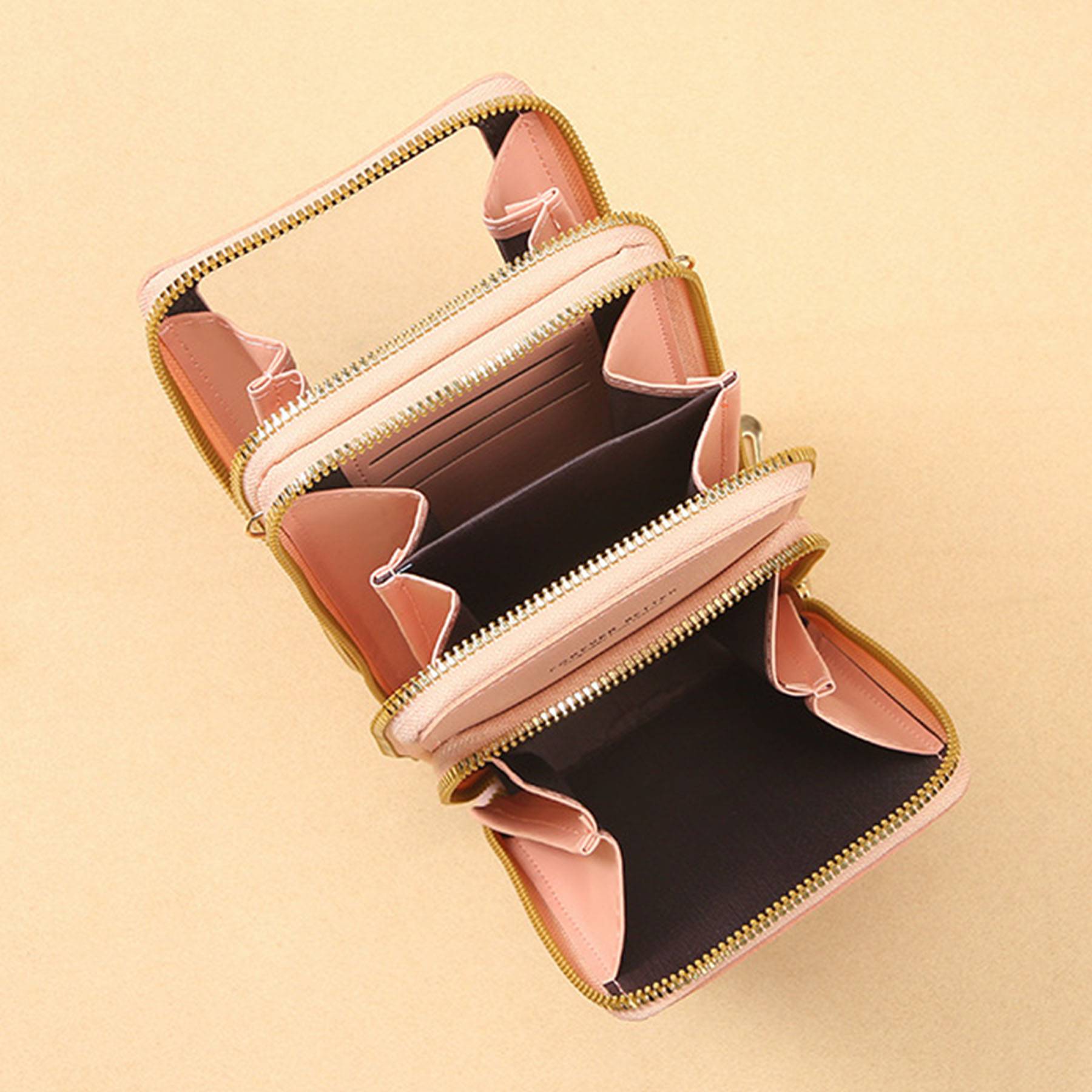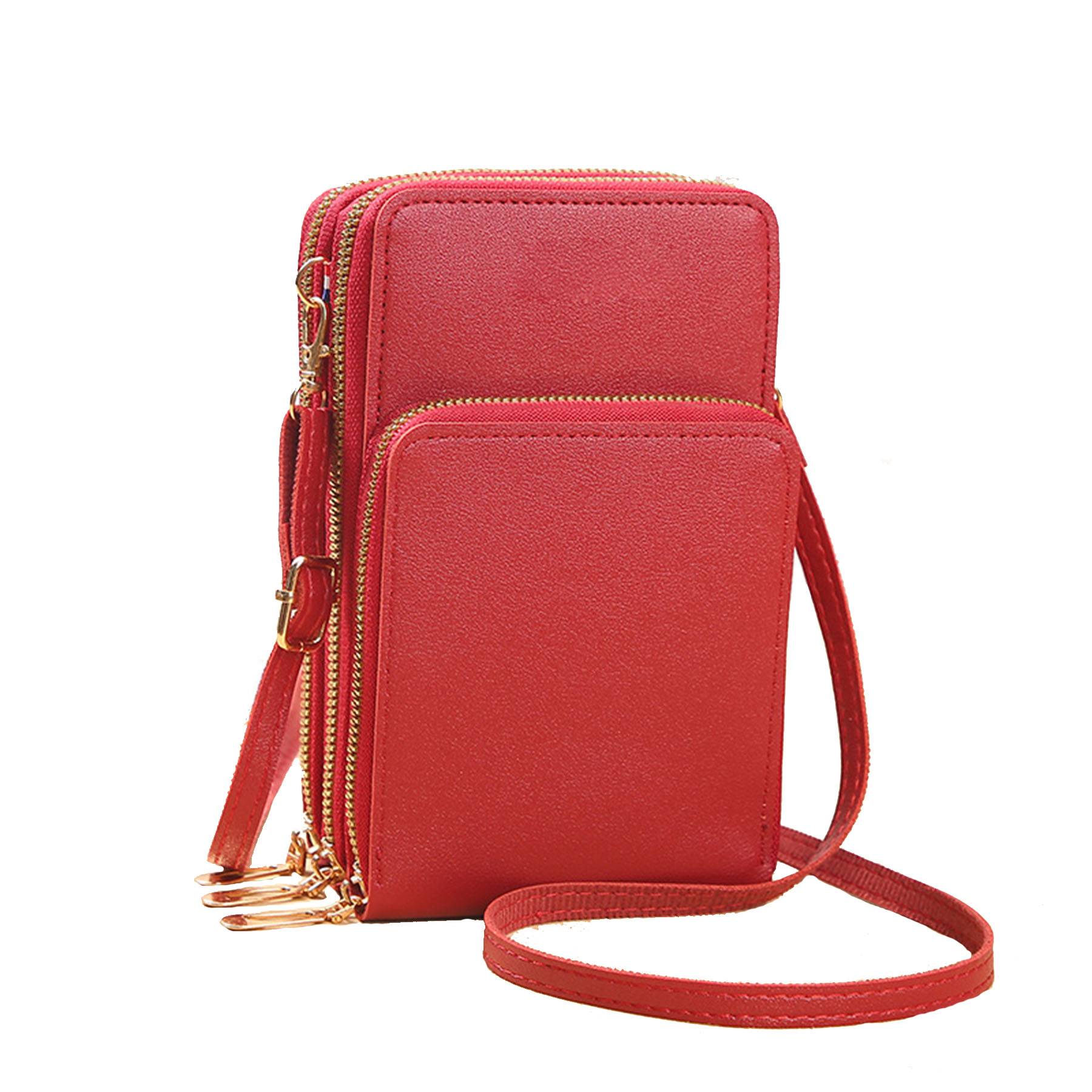 The crossbody bag is designed with high quality soft synthetic leather, durable and beautiful. The back of the bag has a transparent design, you can put your cell phone into the bag to protect it and touch screen at the same time. Size: 4.5″(L)x2.4″(W)7x”(H) Medium size, can organize napkins, lipsticks, coins, cards, keys and so on. Light weight and easy to carry. Three zippered pockets make organizing easier and safer, adding more space for you to place your items.