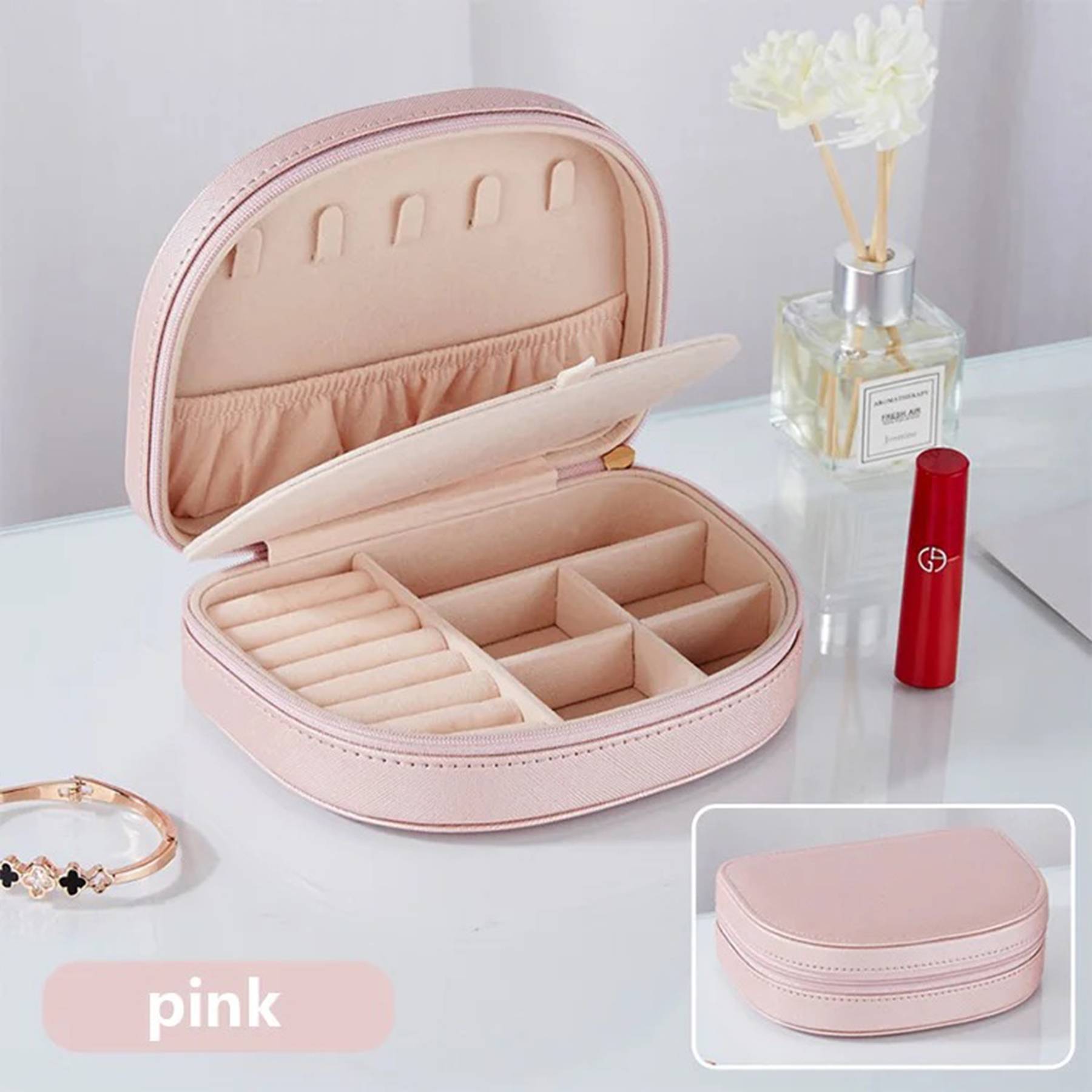 This small travel jewelry box has 5 chain hooks, an elastic pocket, 40 earring straps, a ring row, and removable 4 divided compartments to keep your jewelry separate: no tangle, no loss, no damage.