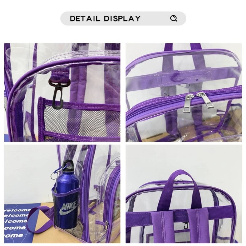 Transparent backpack with large front zipper pockets, padded straps, ring handles and a large main compartment.