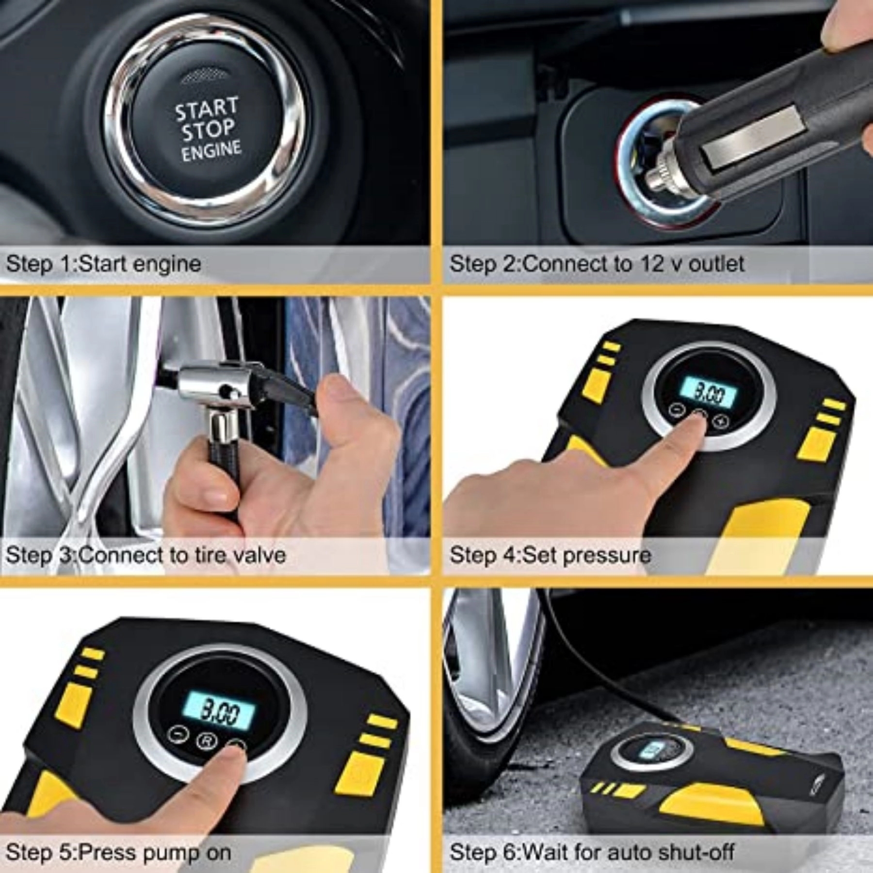 The portable air compressor for cars is made of high-quality materials and is well-designed, which has equipped it with the capacity of pumping air at a speed of 40L/h. This means that it can inflate a 195/55/R15 car tire from 0 to 35psi in under 5 minutes. This air inflator is easy to use and doesn’t take up too much space. The wire is 11.5 feet long, so you can inflate all four tires at once. This air pump for car tires is equipped with a pressure gauge and a digital screen. When the tire is adequately inflated, the air compressor pump will stop automatically. It’s easy and secure to use, and is suitable for first-time users.