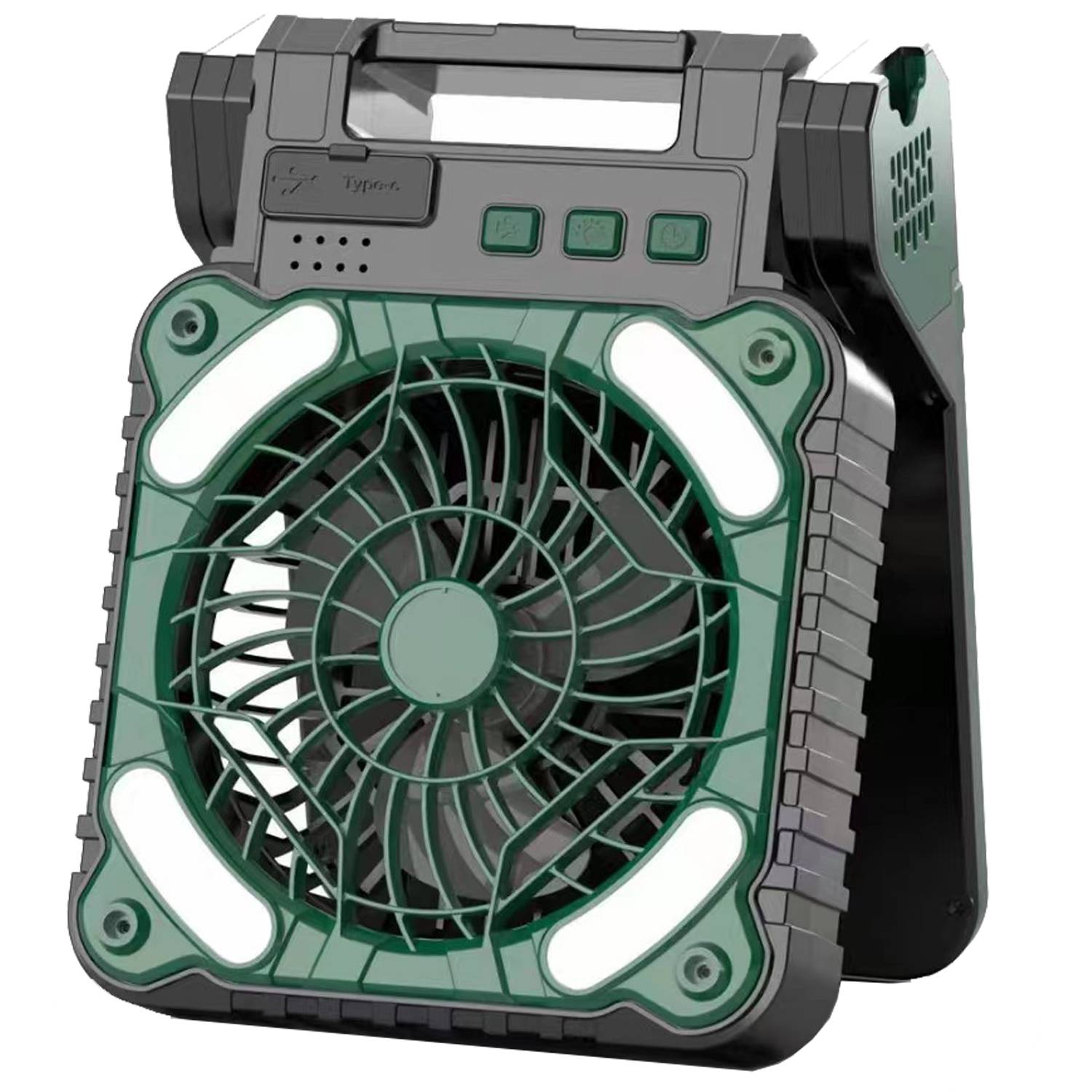 Solar-powered camping fan with LED light, USB recharge, power bank, and dual ports for outdoor adventures.