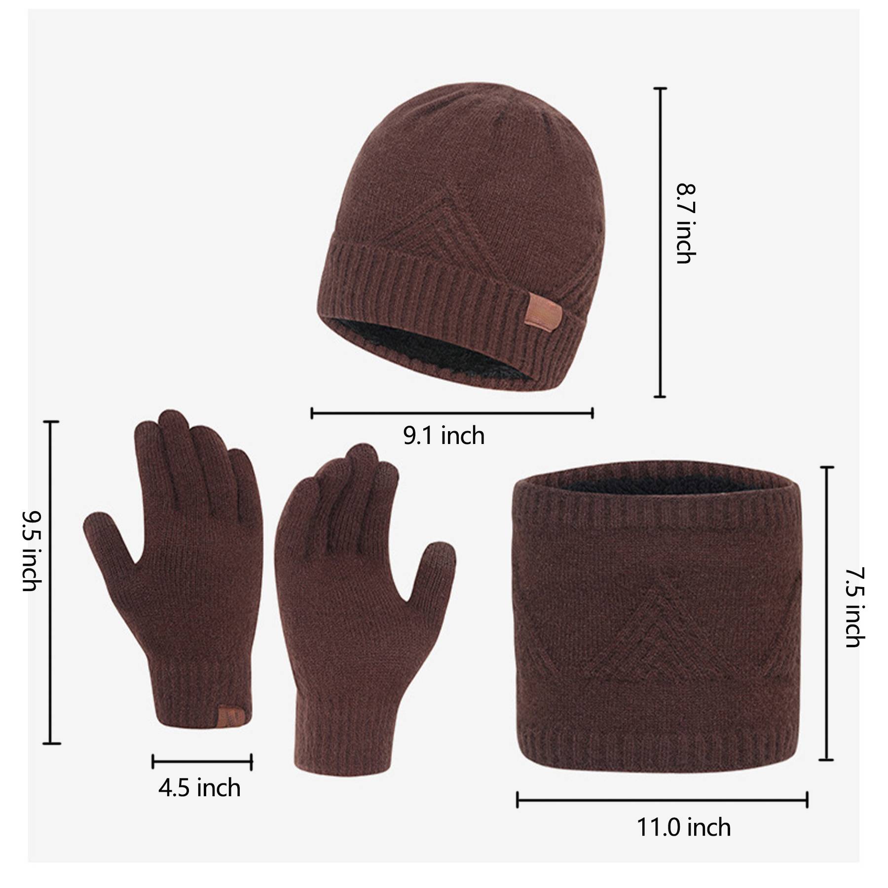 1pc winter knit beanie hat, 1pc circle scarf and 1 pair of touch screen gloves, keep you warm and cozy throughout the winter!Two conductive fingertips to make sure the sensitive response to all touch-screen device. Soft and comfortable, let you enjoy the maximum warmth.Hat length: 9.1″,height: 8.7″. Circle scarf length: 11″, height: 7.5″. Gloves length: 4.5″.height: 9.5″.Winter hat, scarf and gloves set for women, men. stay warm all the time, suitable for outdoor activities and daily warmer.